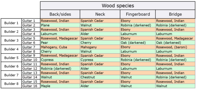 また、それぞれのギターの材料をまとめたものがこちらです: