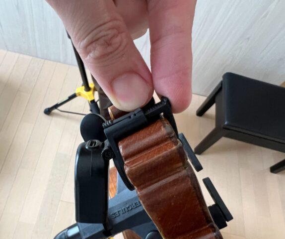 厚みを調整するときは、後部にあるボタンを押しながら下部パーツを上下させることでギターにフィットさせられます: