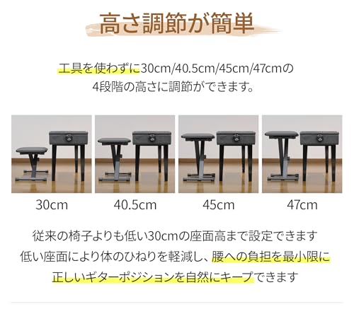 ただ、低さを30cmから47cmと通常のこの手の椅子よりも低く抑えているところが「クラシックギター専用」たる所以なのでしょう。